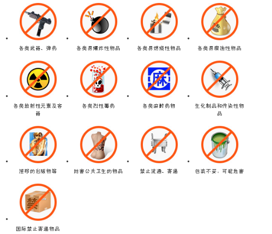 國家法律、法規(guī)、行政規(guī)章明令禁止流通、寄遞或進出境的物品,有國家秘密文件和資料、國家貨幣 偽造的貨幣和有價證券、仿真武器、管制刀具、珍貴文物(包含文房四寶等物品)、瀕危野生動物及其制品等。